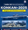 - The bilateral exercise Konkan-2025 between the Indian Navy and the Royal Navy is being conducted from 5 to 12 October off the western coast of India.