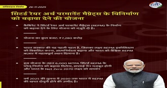 - केंद्रीय मंत्रिमंडल ने 7,280 करोड़ रुपये के वित्तीय परिव्यय के साथ सिंटर्ड रेयर अर्थ परमानेंट मैग्नेट (REPM) के विनिर्माण को बढ़ावा देने की योजना को मंजूरी दी।