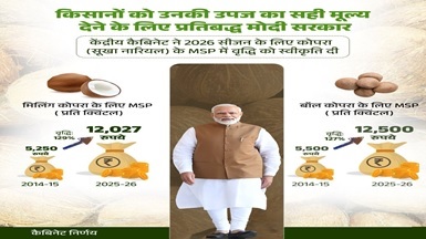 - आर्थिक मामलों की मंत्रिमंडलीय समिति ने किसानों की आय बढ़ाने और उत्पादन को प्रोत्साहन देने के उद्देश्य से वर्ष 2026 के लिए कोपरा का उच्च न्यूनतम समर्थन मूल्य स्वीकृत किया।