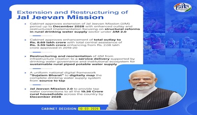 - केंद्रीय मंत्रिमंडल ने 10 मार्च 2026 को जल जीवन मिशन (Jal Jeevan Mission - JJM) की अवधि को दिसंबर 2028 तक बढ़ाने और इसे JJM 2.0 के रूप में पुनर्गठित करने की मंजूरी दी।
