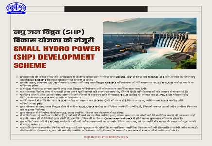 - केंद्रीय मंत्रिमंडल ने वित्त वर्ष 2026-27 से 2030-31 की अवधि के लिए ‘लघु जलविद्युत विकास योजना’ (Small Hydro Power - SHP) को मंजूरी दी।