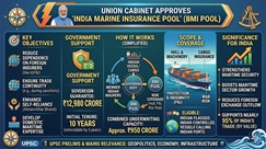 - प्रधानमंत्री नरेंद्र मोदी की अध्यक्षता में केंद्रीय मंत्रिमंडल ने 'भारत समुद्री बीमा पूल' (BMI Pool) के गठन को मंजूरी दी।