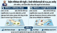 - प्रधानमंत्री नरेंद्र मोदी की अध्यक्षता में केंद्रीय मंत्रिमंडल ने उत्तर प्रदेश और आंध्र प्रदेश में रेलवे के बुनियादी ढांचे को मजबूत करने के लिए 24,815 करोड़ रुपये की कुल लागत वाली दो प्रमुख मल्टीट्रैकिंग परियोजनाओं को मंजूरी दी।