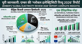 - एम्बर की सातवीं वार्षिक 'ग्लोबल इलेक्ट्रिसिटी रिव्यू 2026' रिपोर्ट के अनुसार, 2025 में वैश्विक बिजली उत्पादन में नवीकरणीय ऊर्जा की हिस्सेदारी 33.8% एवं कोयले की हिस्सेदारी 33.0% थी।