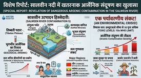 - तिब्बती पठार पर स्थित तांगुला पर्वत से उद्गम होने वाली सालवीन नदी में खतरनाक स्तर का आर्सेनिक संदूषण पाया गया है।