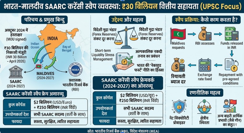 - India has approved financial assistance of ₹30 billion to Maldives under the SAARC Swap Arrangement.