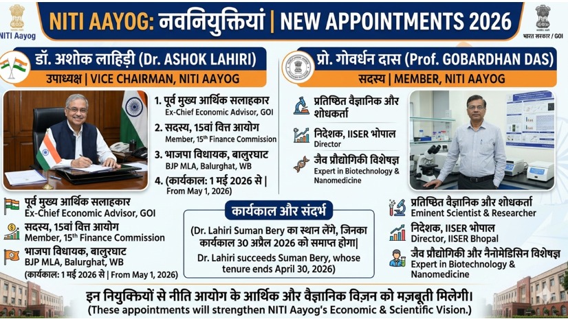 - Ashok Lahiri—a BJP MLA from West Bengal and former Chief Economic Adviser (CEA)—has been appointed as the new Vice-Chairperson of NITI Aayog, while scientist Goverdhan Das has been appointed as a Member.
