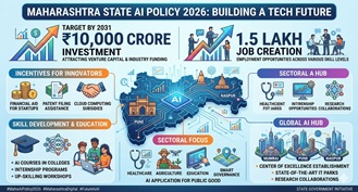 - महाराष्ट्र कैबिनेट ने नई AI नीति 2026 को मंजूरी दी, जिसका लक्ष्य 2031 तक ₹10,000 करोड़ का निवेश आकर्षित करना और 1.5 लाख नौकरियां पैदा करना है।